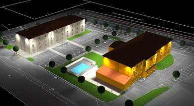 Création d’un projet d’éclairage mixte parking Hôtel depuis plan DWG + section courantes route